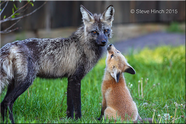 This photo illustrates why cross fox and silver fox are considered “forms” or variations of the species Vulpes Vulpes, or commonly called red fox. In order to be a subspecies of the red fox, these two forms would need to be isolated genetically and to not interbreed with “normal” red fox, though they are certainly capable of doing so. But both silver fox and cross fox variants share the same geographic areas and produce offspring that can show the genetic variant or also produce “normal” red fox kits, as seen here as a kit interacts with it’s father