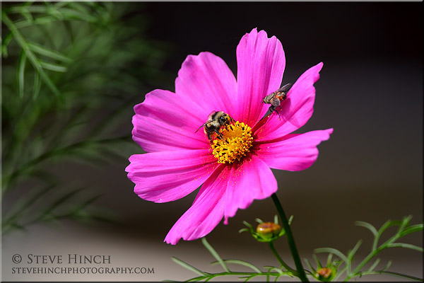 Cosmos, a bee, and a fly. Canon 5d4, 500mm + 1.4 TC, tripod, 1/2000 @ f5.6, ISO 800