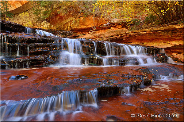 This scene can be found on a permit-only hike in Utah’s Zion National Park away from the crowded canyon. The trail follows the stream, some times in it to several beautiful spots such as this one. Fall leaves only add to the beauty. More images of Utah’s parks can be viewed here: Utah Gallery.