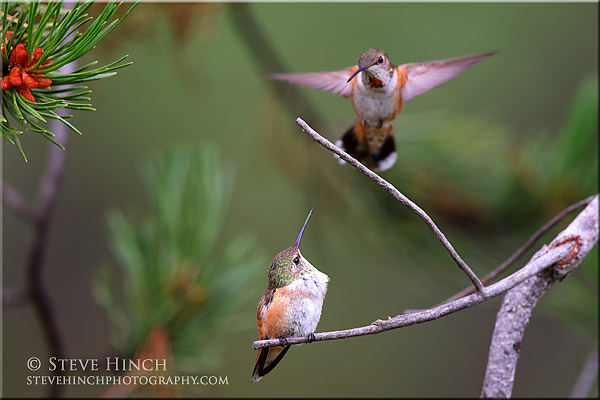 Hummingbirds in general are territorial, but Rufous Hummingbirds are more aggressive than most other species. Primarily I’ve had Rufous Hummingbirds visiting and they’re constantly competing to control the feeders and flowers. I thought it would be cool to have two birds in one image but really thought it would be impossible. But I had the chance last week when the perched bird would not be intimidated by the aggressor. Eventually they even perched next to each other for a few seconds. The bird in flight is not in focus, but otherwise I was pretty happy with how this came out. The light was low and if I had tried for more depth of field, I wouldn’t have been able to stop the fast movement of the flying bird.