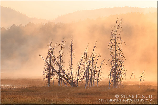 Steam, mist, and some dead trees. These trees died as a result of the thermal runoff from hot springs and geysers in the area. The trees brought the thermal water into their systems and the minerals essentially turned the base of the tress to stone. The bottoms of the trees are white as a result of the minerals absorbed and they are referred to as “bobby sock” trees in reference to a fashion from many years ago.