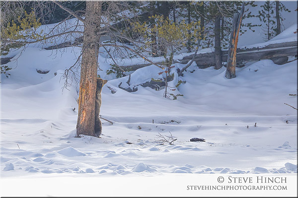 Do you see the bear? Do you? Unfortunately this grizzly chose the backside of the tree to scratch it’s backside against. Even at that, it was a pretty good distance off and I needed to crop this image a fair bit to make it worth while to post. As with my last bear photo, it will probably never make it on my website but it was still a fun nature moment to witness and I felt this image shows how difficult it can be to see wildlife even against a snowy landscape at a couple hundred yards distance.